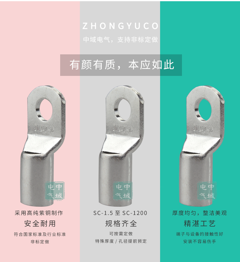 SC铜鼻子JKY型号。SC表示类别意思是带观察口铜端子,浙江中域电气有限公司现货供应SC1.5-4/5.5至SC1000-20窥口铜鼻子。支持非标定做铜鼻子。