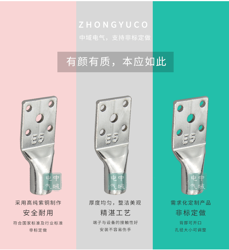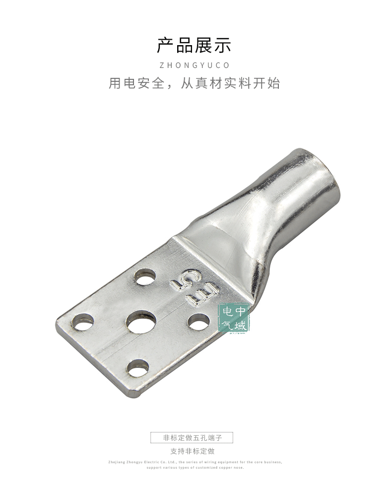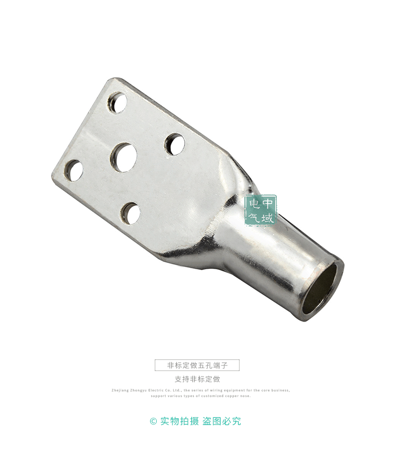 中域电气支持非标定做铜鼻子,五孔铜鼻子采用高纯紫铜制作,表层镀锡,增加导电性,抗氧化。用途 :接线端子适用于配装置中电线,电力电缆与电器设备的连接。