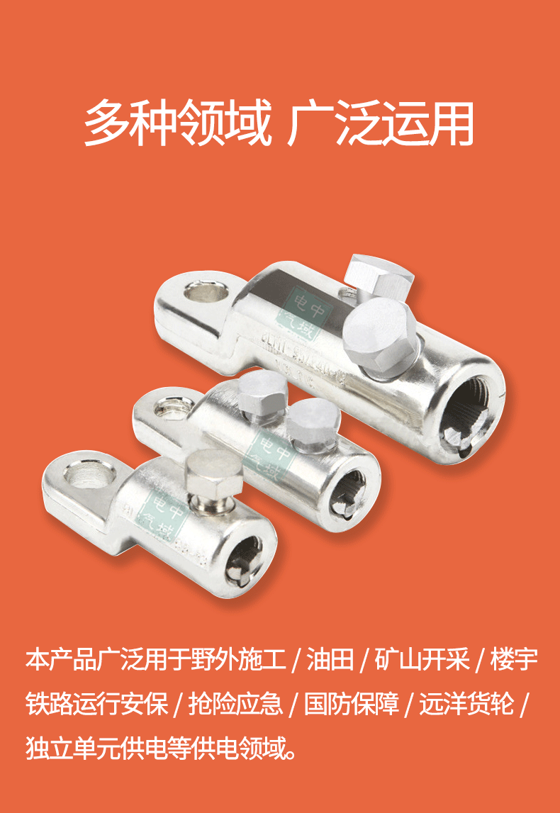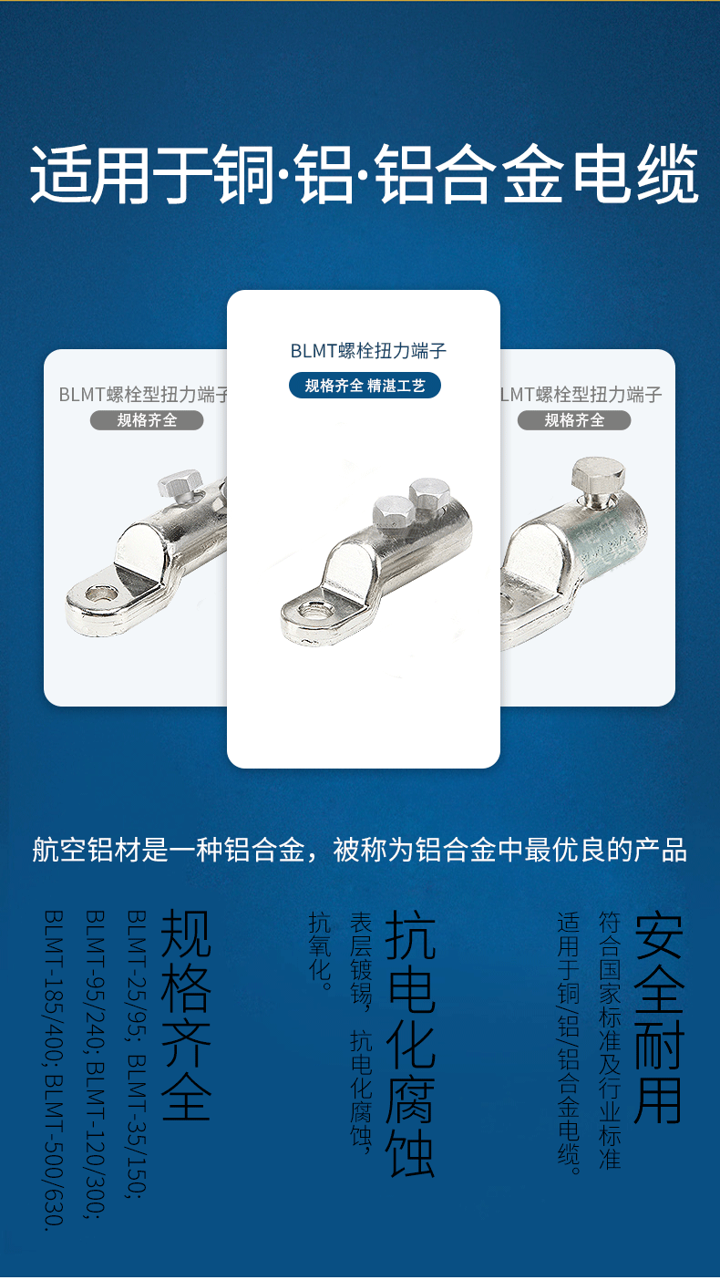 浙江中域电气有限公司现货供应BLMT螺栓型扭力端子,规格BLMT-25/95至BLMT-120/300平方,其他规格按单生产。BLMT螺栓型扭力端子采用航空7系铝合金材料锻压而成,符合国家标准及行业标准,适用于铜/铝/铝合金电缆,抗电化腐蚀。