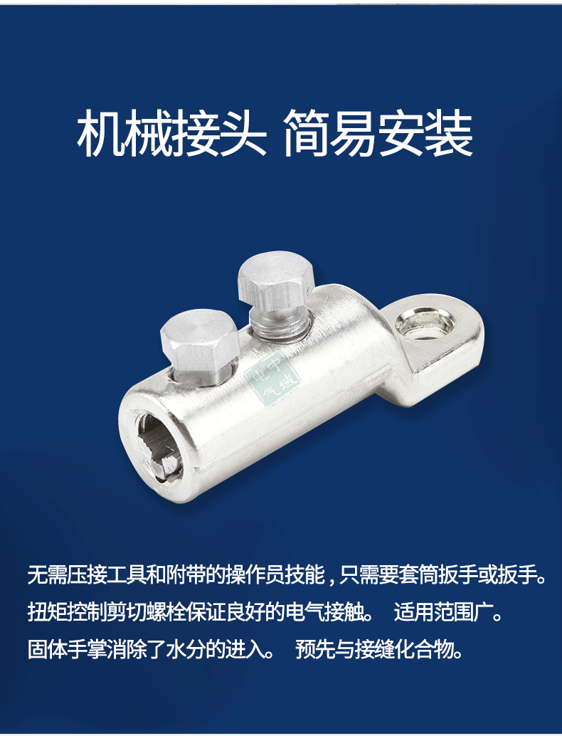 BLMT铝合金扭力端子产品特点:螺栓型扭力端子,机械接头,无需压接工具和附带的操作员技能,只需要套筒扳手或扳手。扭矩控制剪切螺栓保证良好的电气接触。适用范围广,固体手掌消除了水分的进入。预先与接缝化合物。
