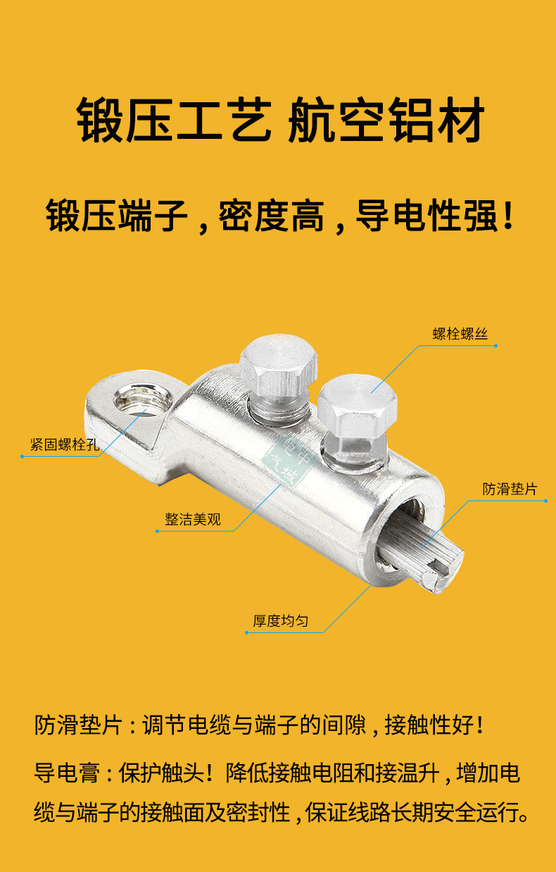 浙江中域电气有限公司因真材实料及精湛工艺赢得客户信赖,产品均采用优质全新材料,拒绝回收材料!BLMT铝合金扭力端子,采用航空7系铝材,航空铝材是一种铝合金,被称为铝合金中最优良的产品,硬度大,难成型,中域电气采用锻压工艺制造,产品密度相对较高,导电性好。表层环保镀锡,抗氧化。