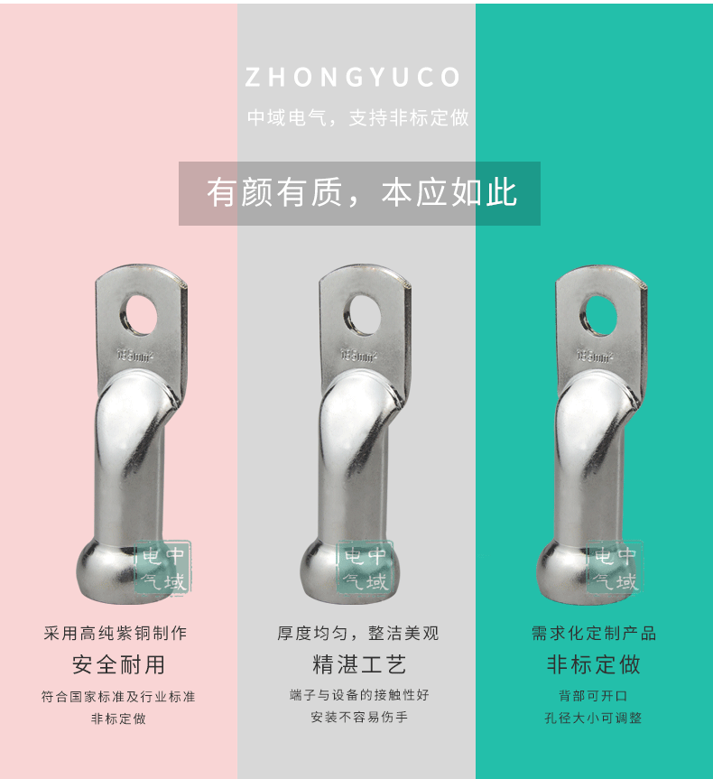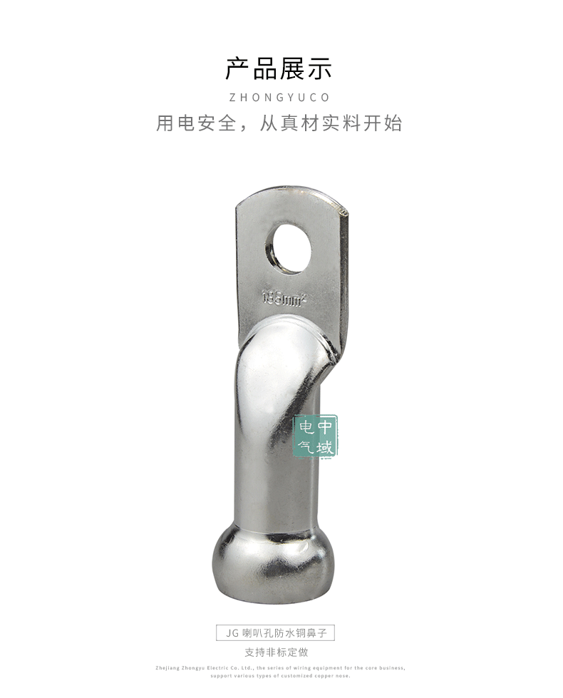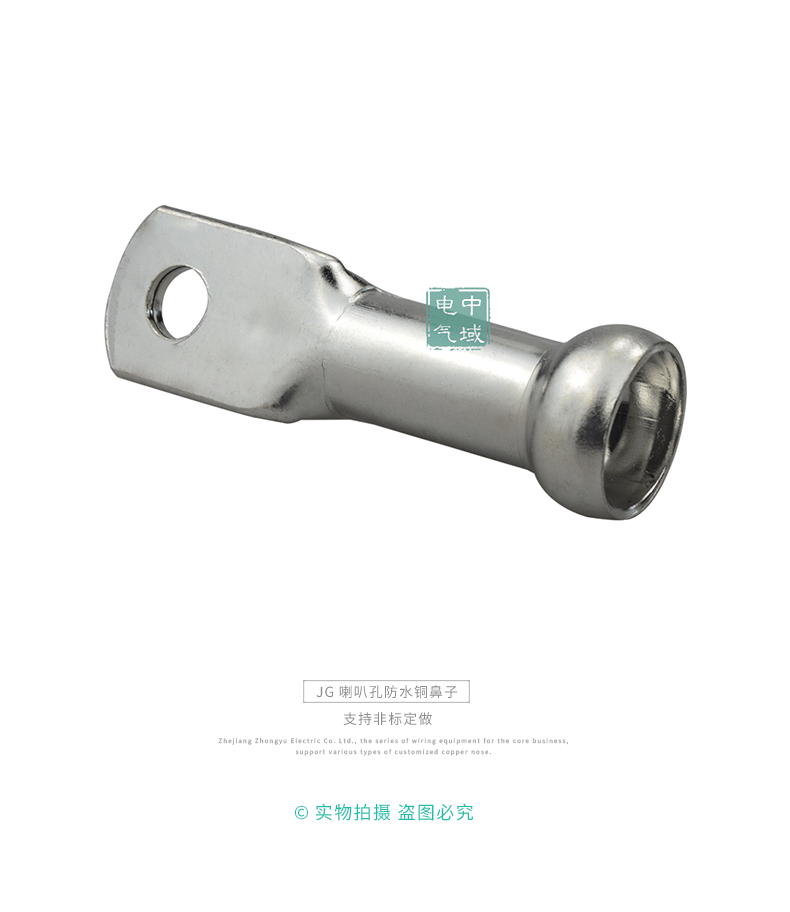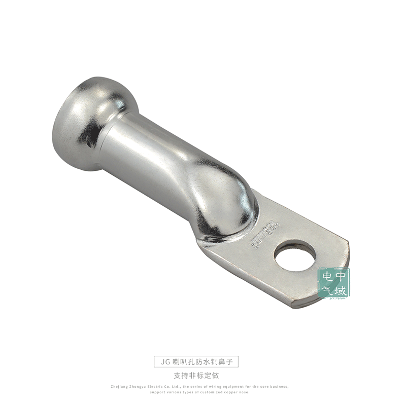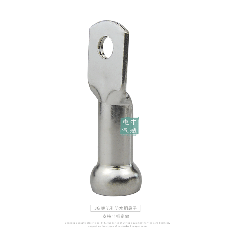 中域电气,DTGK喇叭孔防水铜鼻子,也称火牛线鼻子,表层镀锡,抗氧化性强。由高纯铜管做成, 产品外貌为锅铲圆头,接线管为喇叭孔,方便安装,末端插进剥皮后的电缆用端子钳压紧即可。有一定防水作用,但不是100%防水。用途 :接线端子适用于配装置中电线,电力电缆与电器设备的连接。